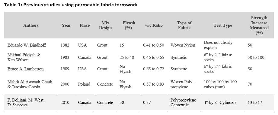- Table 1: Previous studies using permeable fabric formwork
