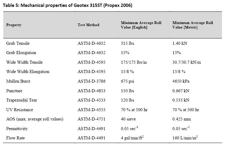 - Table 5: Mechanical properties of Geotex 315ST (Propex 2006)