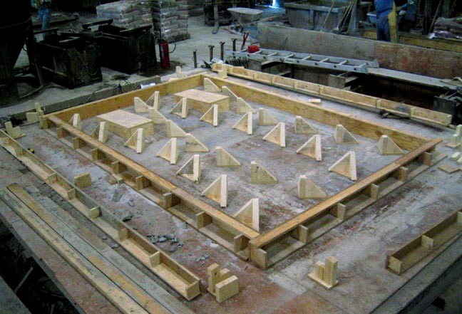 - Fig. 4. Placing blockouts and interior supports prior to stretching in fabric in full scale wall panel formwork.