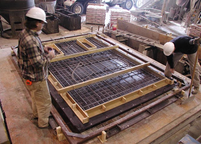 - Fig. 5. Securing fabric and placing reinforcenment in full scale wall panel formwork.