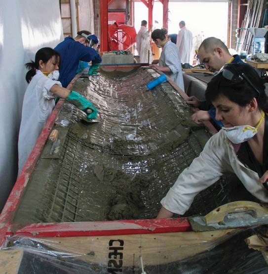 - Fig. 43. Placing concrete and carbon grid in fabric mold to form double curvature funicular thin-shell vault (C.A.S.T. photo).